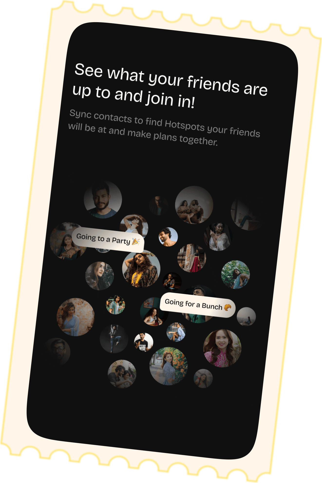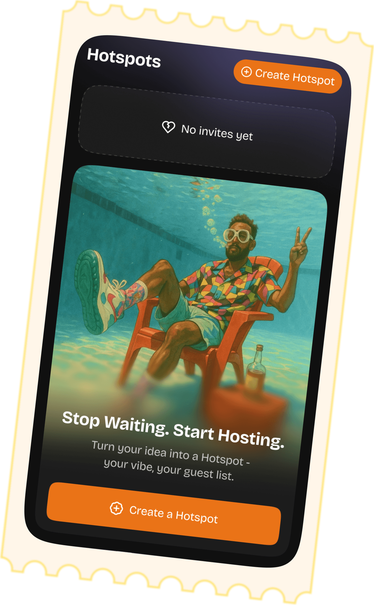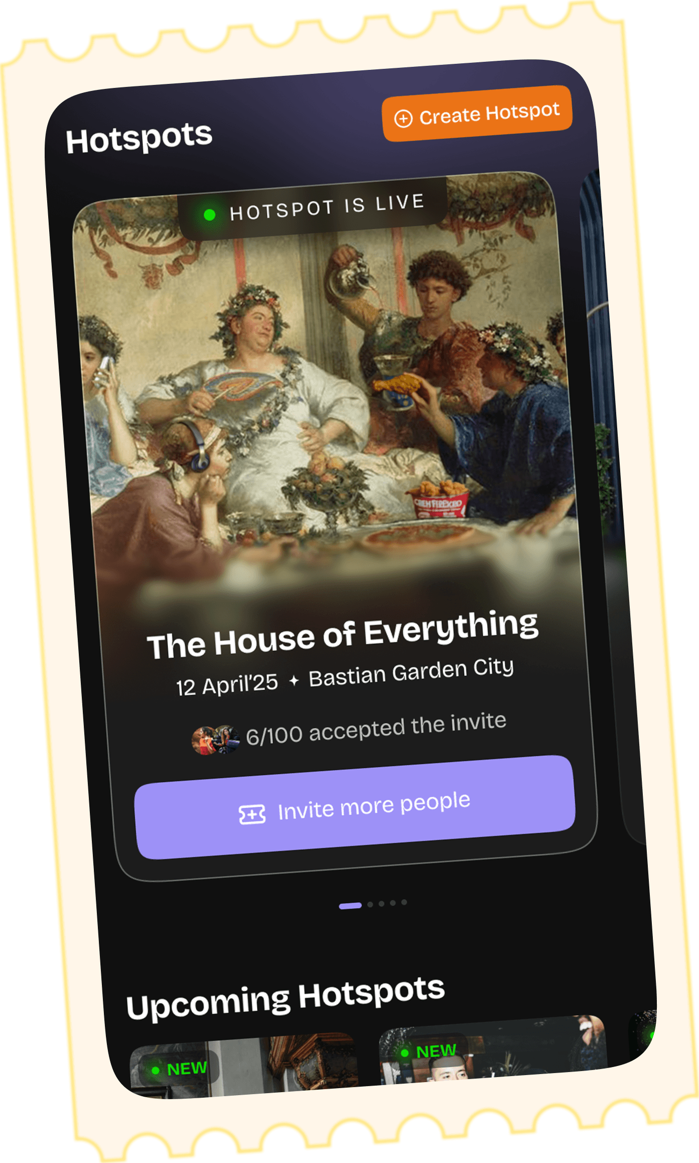 Download the app from App Store or Play Store. Complete your profile, add your interests - this helps the right hosts find you and send you Hotspot invites. Accept invites or request invites to Hotspots you like, or create your own!
